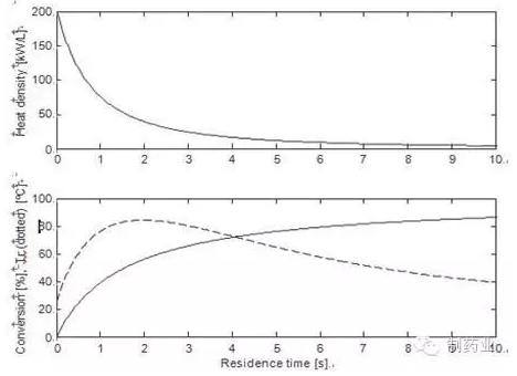 2芳香胺和雙乙烯酮在一個(gè)管式反應(yīng)器中,真實(shí)情況下經(jīng)過(guò)乙?;⑼ㄟ^(guò)電腦模擬得出測(cè)量的熱密度,用于停留時(shí)間和轉(zhuǎn)換的功能報(bào)告中。反應(yīng)的半衰期約為1.5sec,所以主要分布在動(dòng)力情況中(B型反應(yīng)),二階反應(yīng)說(shuō)明了大部分的熱密度都分布在反應(yīng)的初始時(shí)期,在這種情況下,小的傳統(tǒng)管(直徑3㎜)無(wú)法提取足夠的建立在流體力學(xué)(Tr)和導(dǎo)熱液之間的熱量和溫度梯度。反應(yīng)初期需要使用微反應(yīng)器,然而一旦最初的熱密度被消耗(99%的轉(zhuǎn)換耗時(shí)154sec),便可使用常規(guī)的(非微型)停留時(shí)間模塊。以下參數(shù)可用于仿真模擬:傳熱系數(shù)500w/㎡/k,流體熱容量2kJ/kg/k,二階動(dòng)力學(xué)常數(shù)0.363l/mol/s,焓180kJ/mol,雙乙烯酮與胺濃度15%,傳熱流體在25℃恒溫時(shí),未考慮活化能。
